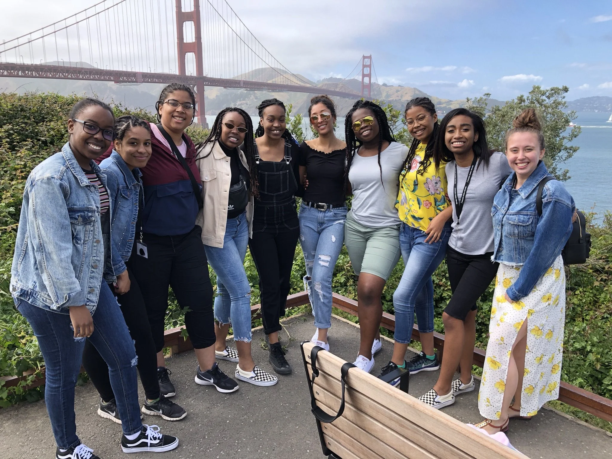 All the female student attendees from Ontario posing in front of the Golden Gate Bridge.